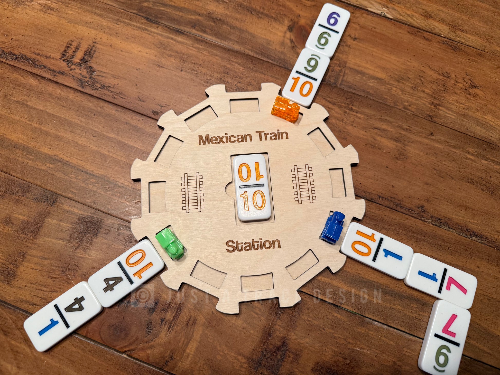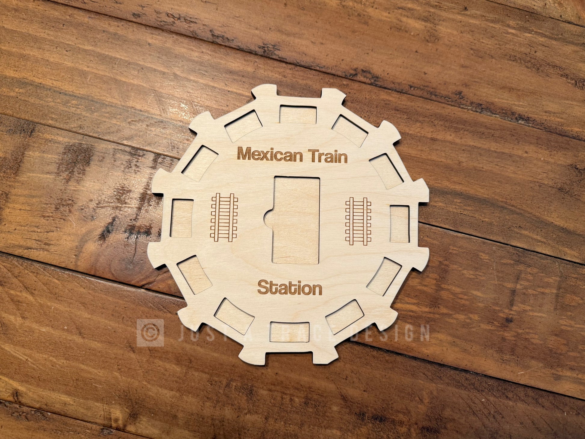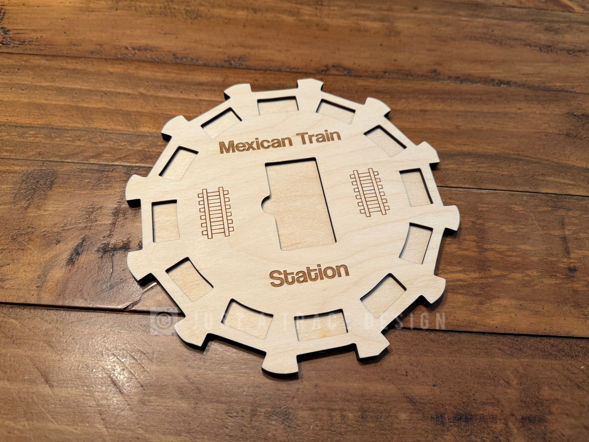 Our 12 Player Mexican Train Hub is a handcrafted, durable game accessory designed to organize and enhance the play of Mexican Train Dominoes. Made from high-quality birch, this hub features engraved train tracks radiating from a central station, providing designated spots for each player’s train and the communal Mexican Train.