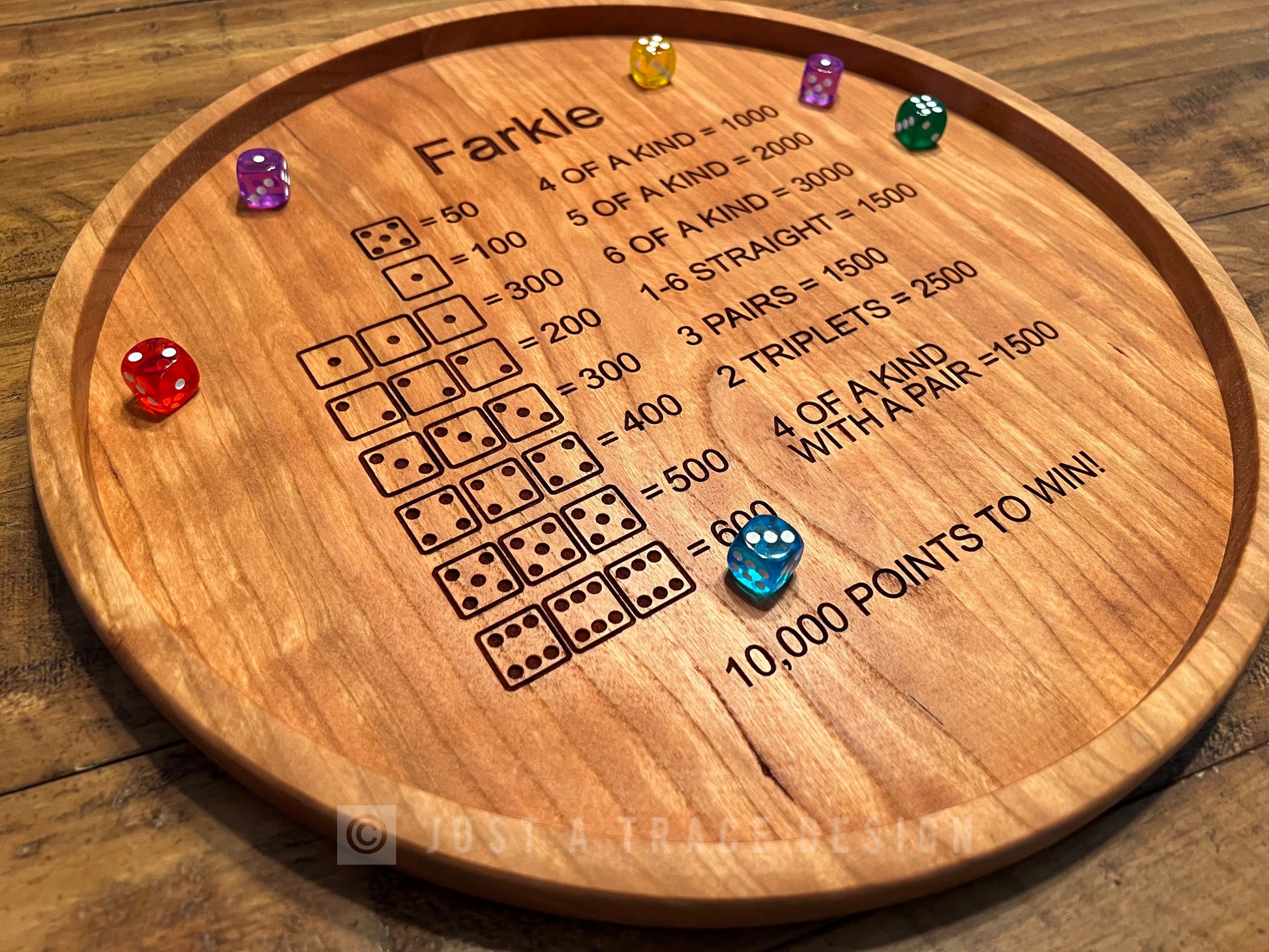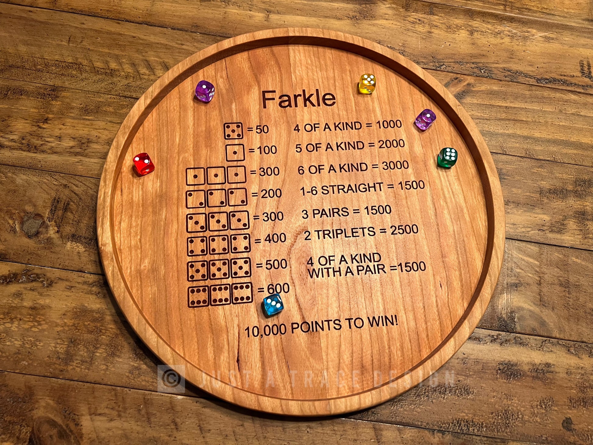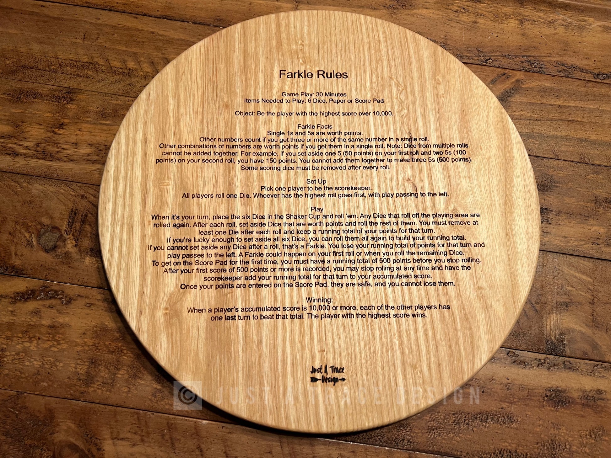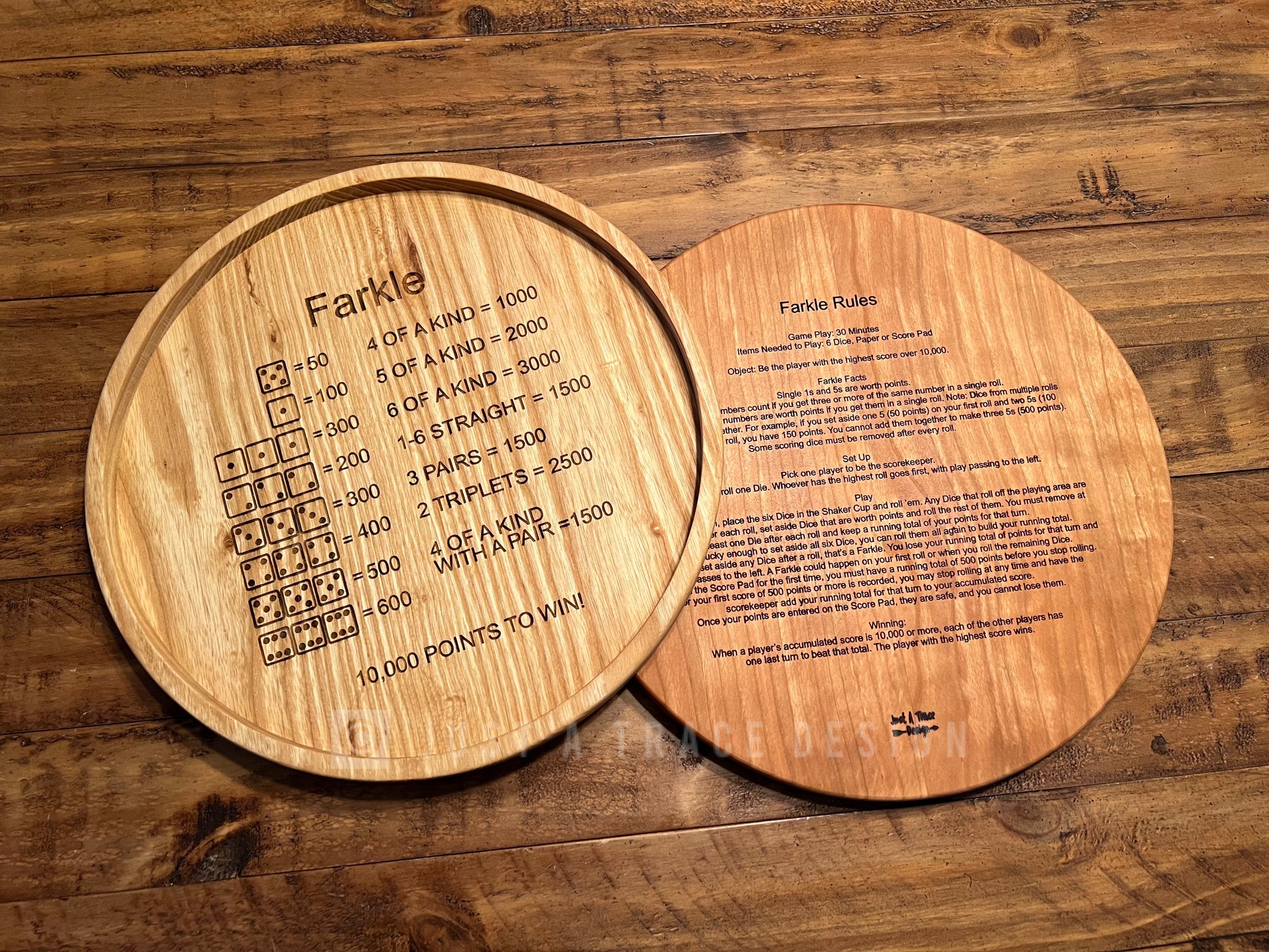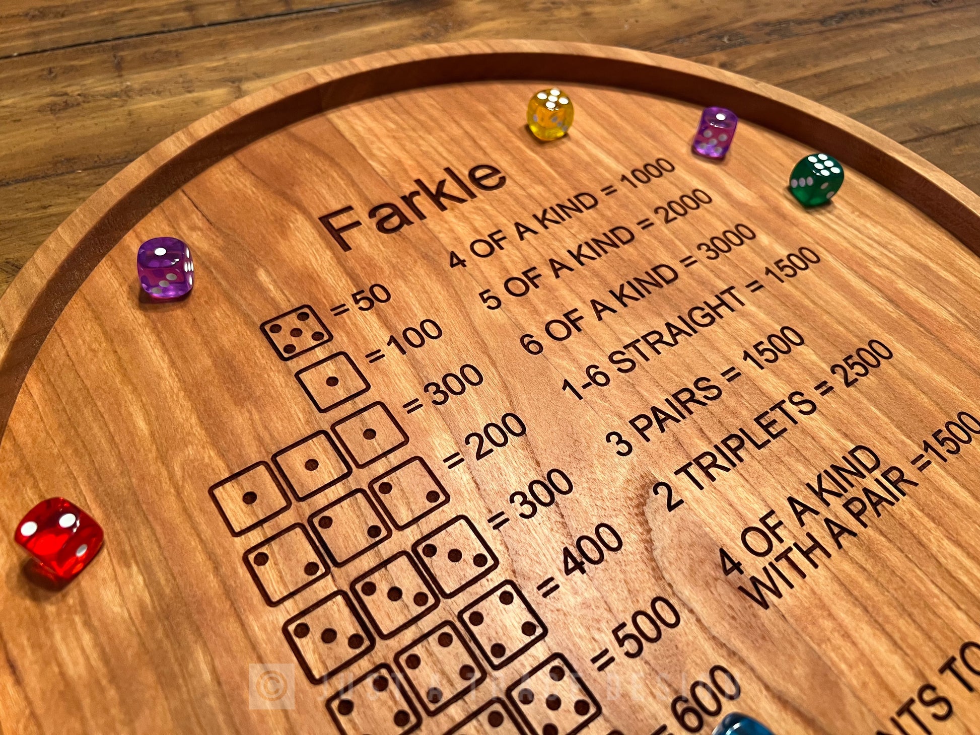 A Farkle scoring guide is laser engraved right in the center of the dice tray so everyone can keep score. The rules are also engraved on the back side of the tray for convenience.