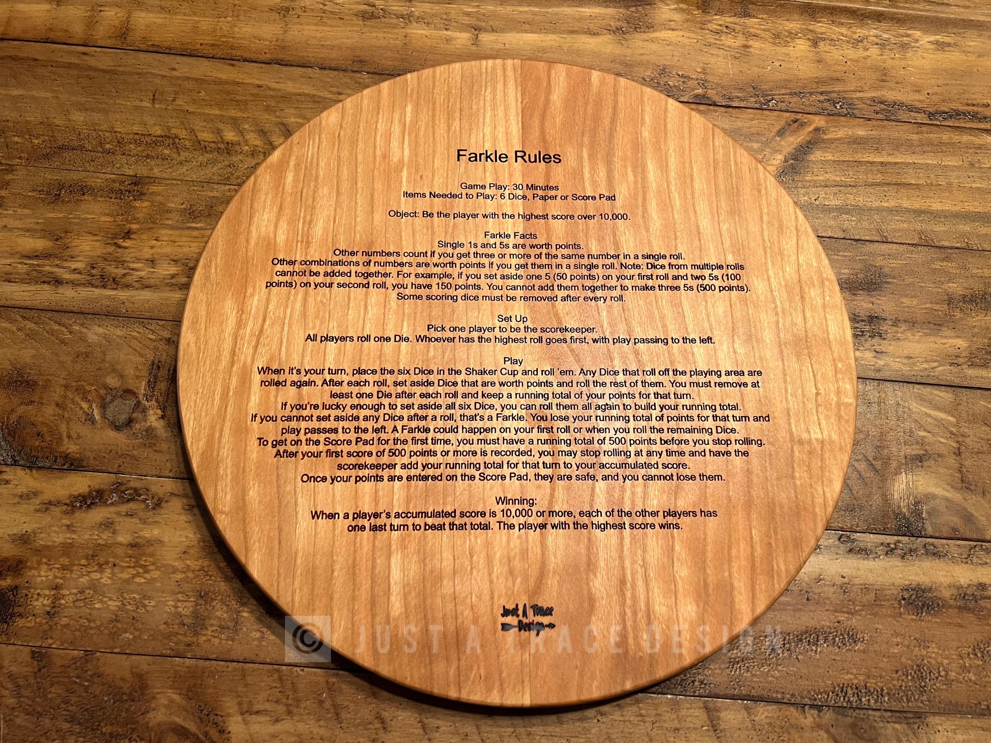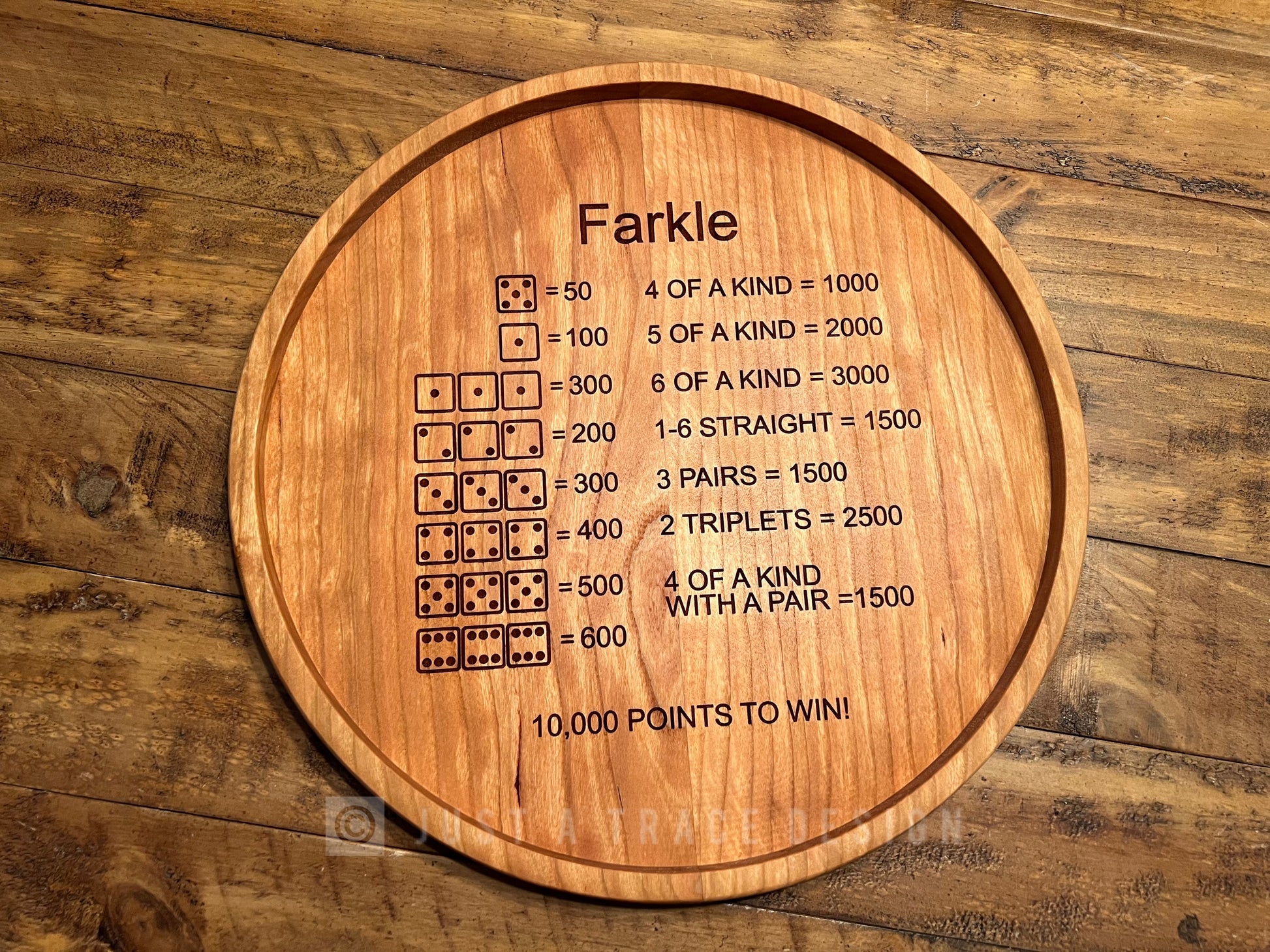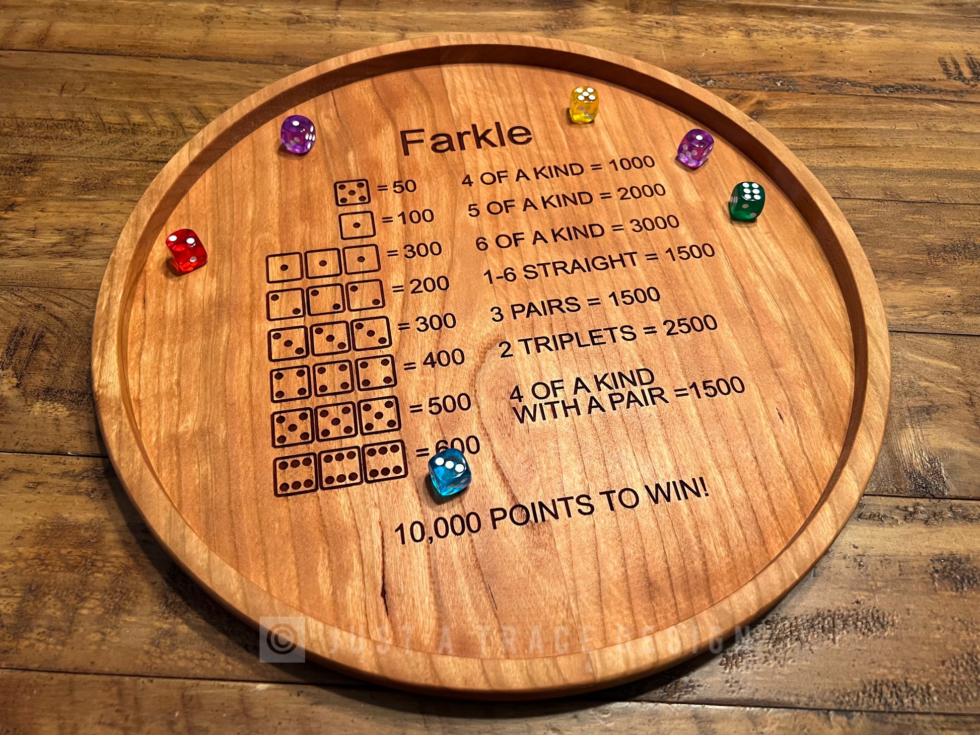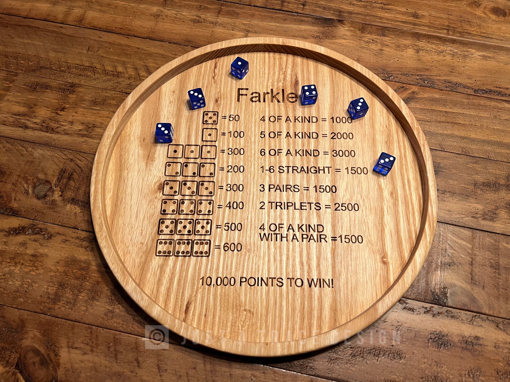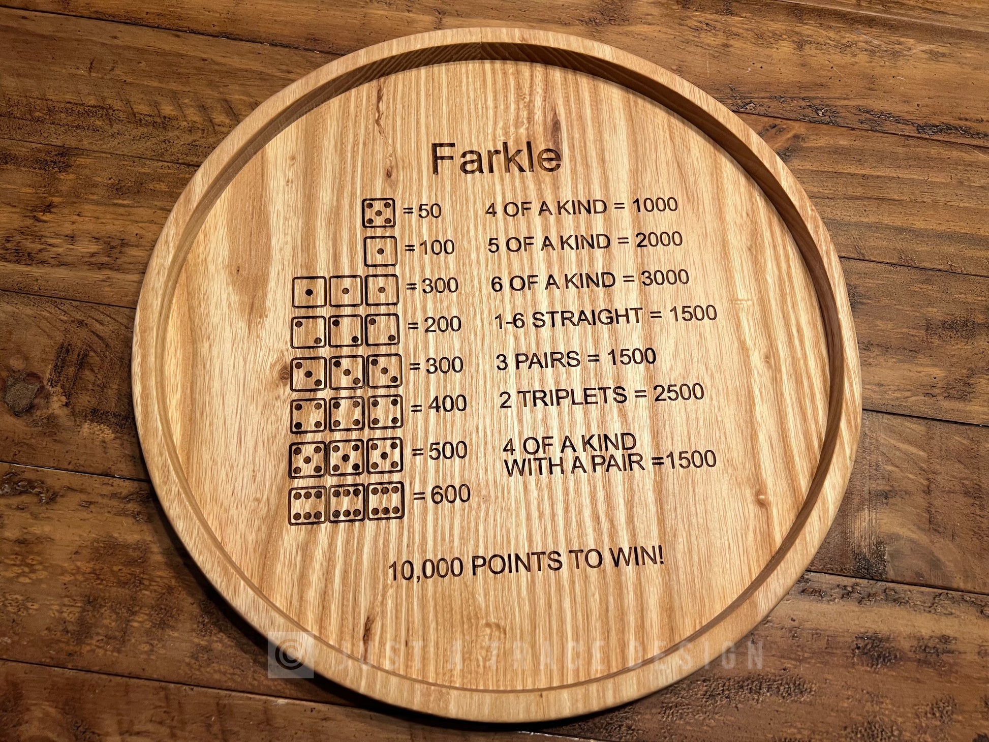 A Farkle scoring guide is laser engraved right in the center of the dice tray so everyone can keep score. The rules are also engraved on the back side of the tray for convenience.
