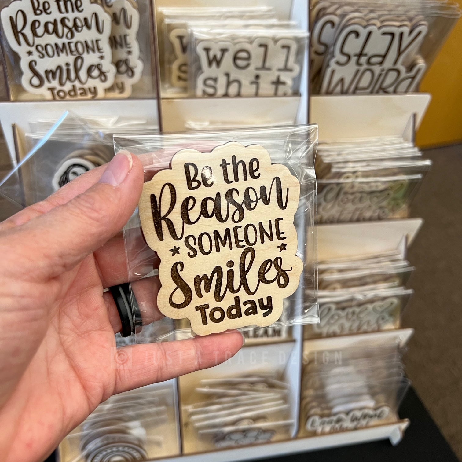 Introducing our super cool Be The Reason Someone Smiles Today Wood Magnet! This little guy is here to bring some serious style and positive vibes to your fridge, magnetic board, or any magnetic surface you can think of.