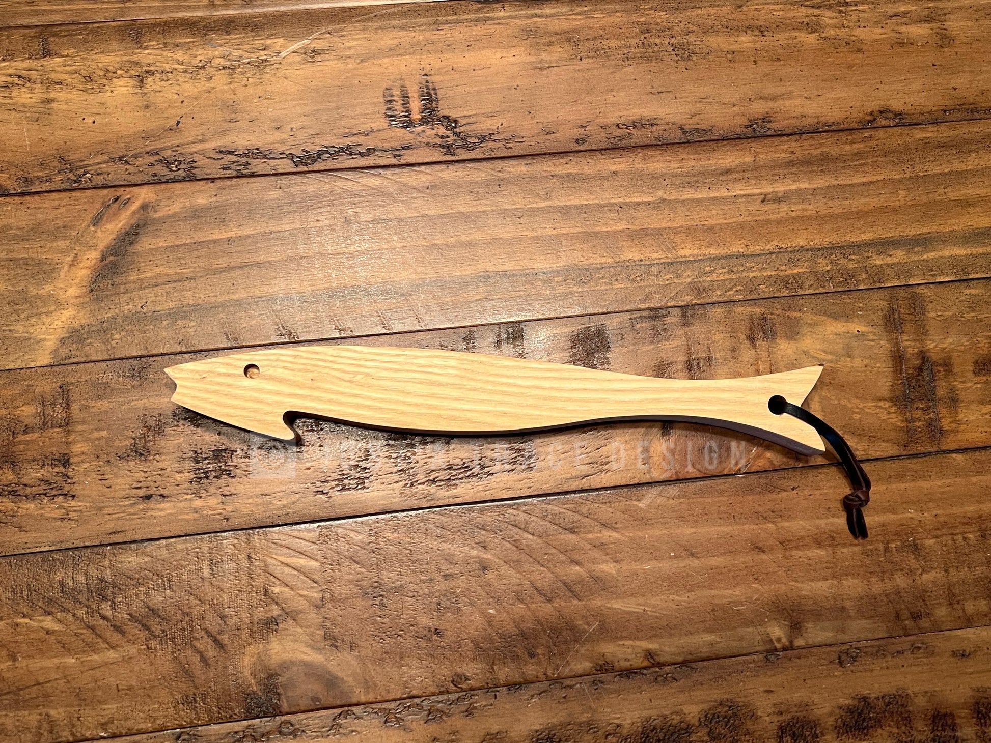 Each Wooden Oven Rack Puller is cut from a solid piece of cherry or ash hardwood and comes with a leather strap so it can be easily hung on a hook for easy access. Cut in the shape of a fish.
