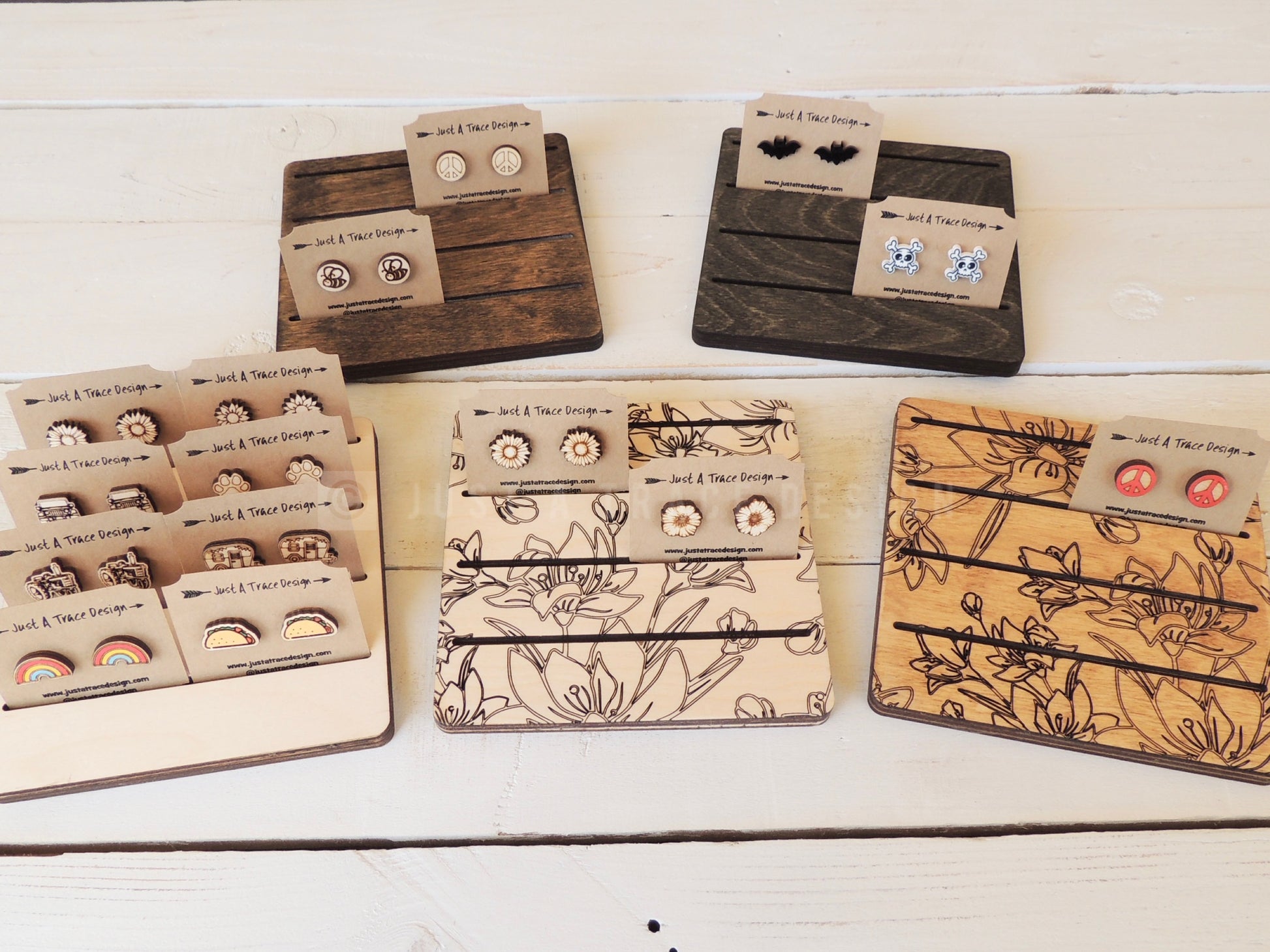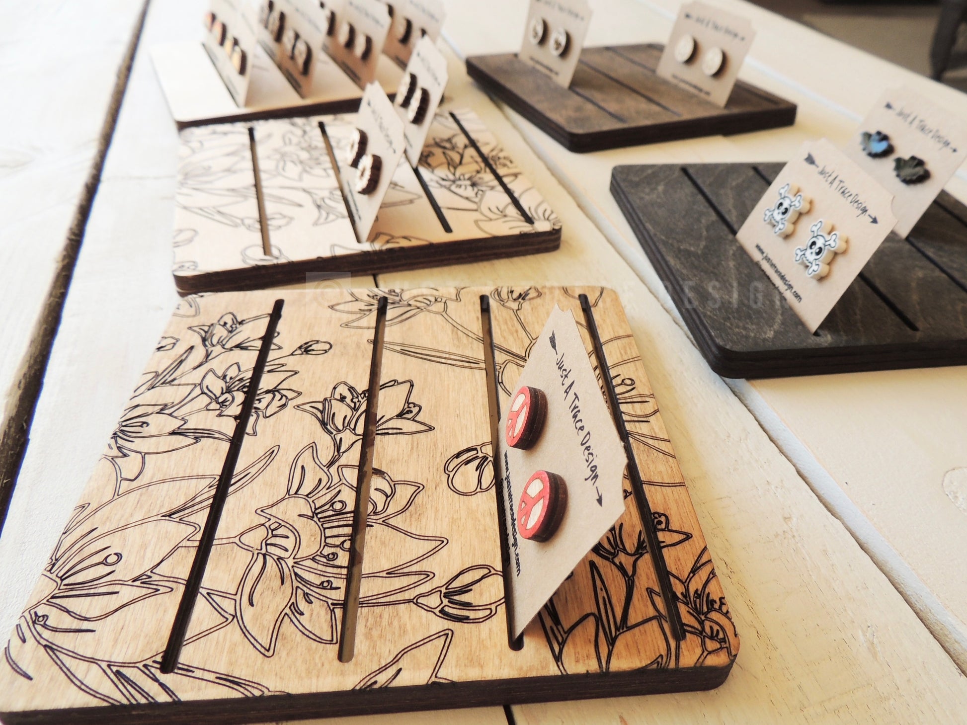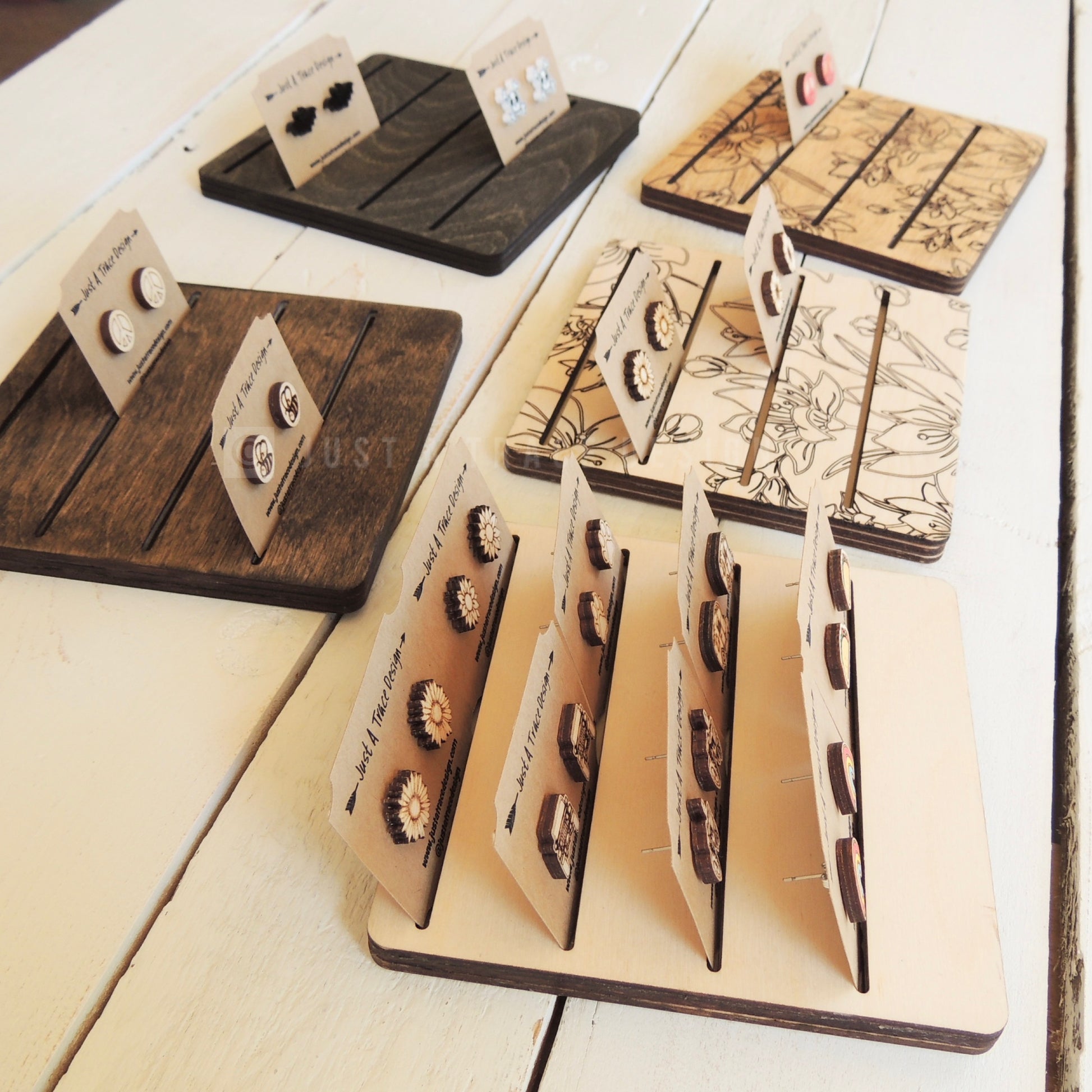 Each Earring Card Display Stand is made by the same process and look very much the same, no two stands are ever exactly alike in color and grain, creating a unique, one of a kind piece.