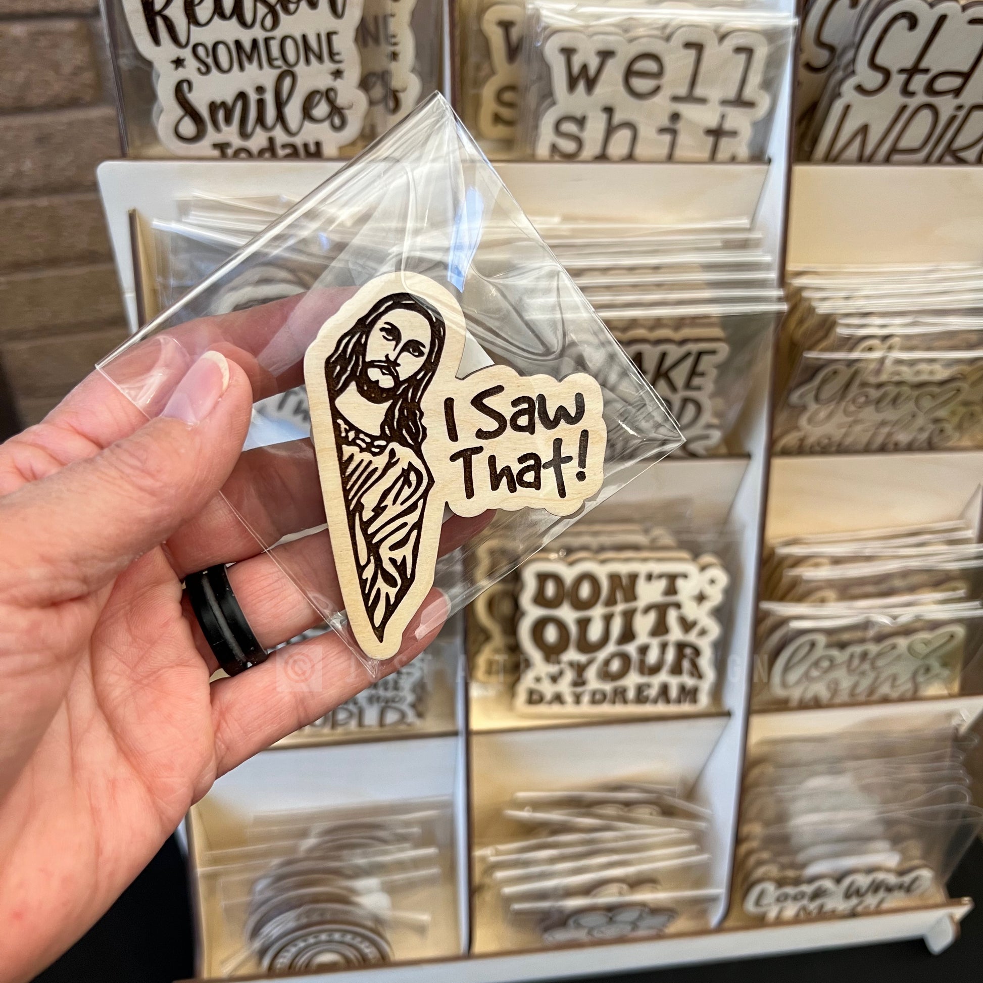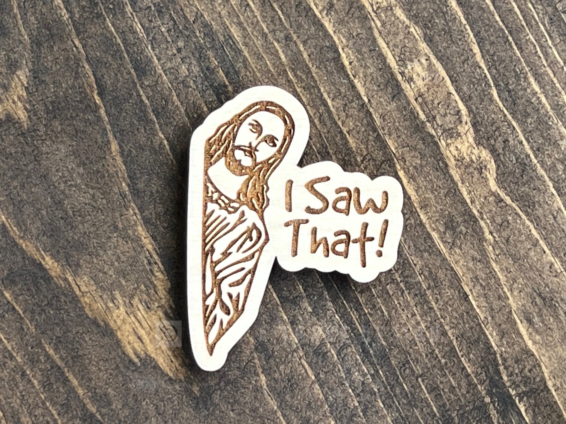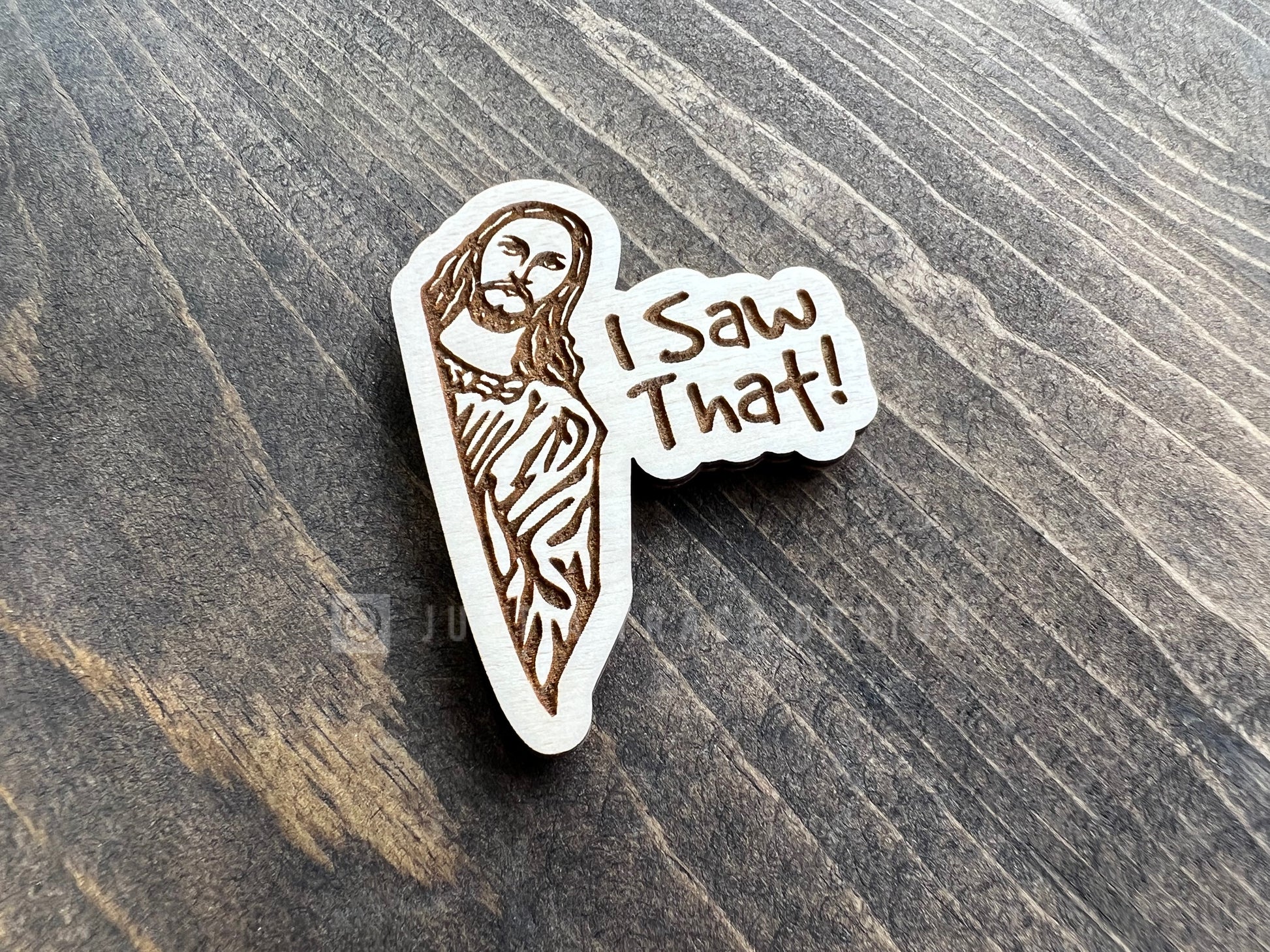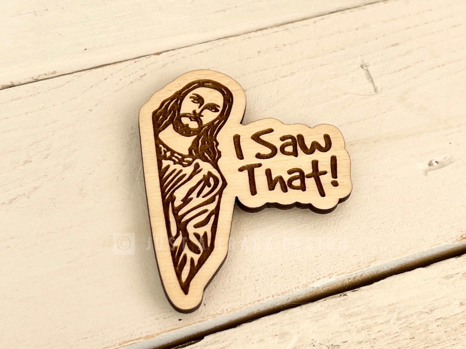 Introducing our I Saw That Jesus Wood Magnet! A funny way to add a touch of unique design to any fridge, magnetic board, or any magnetic surface you can think of.