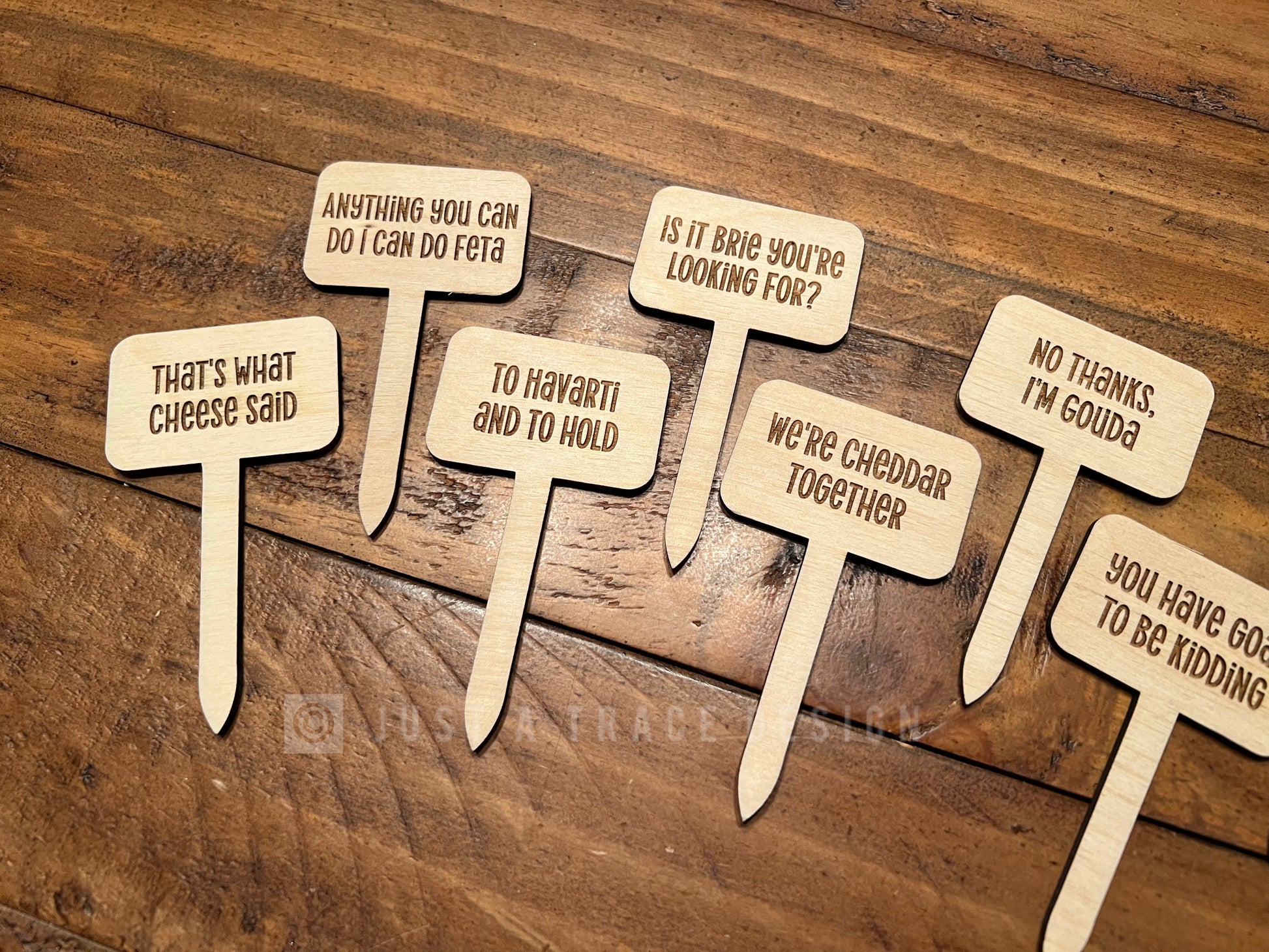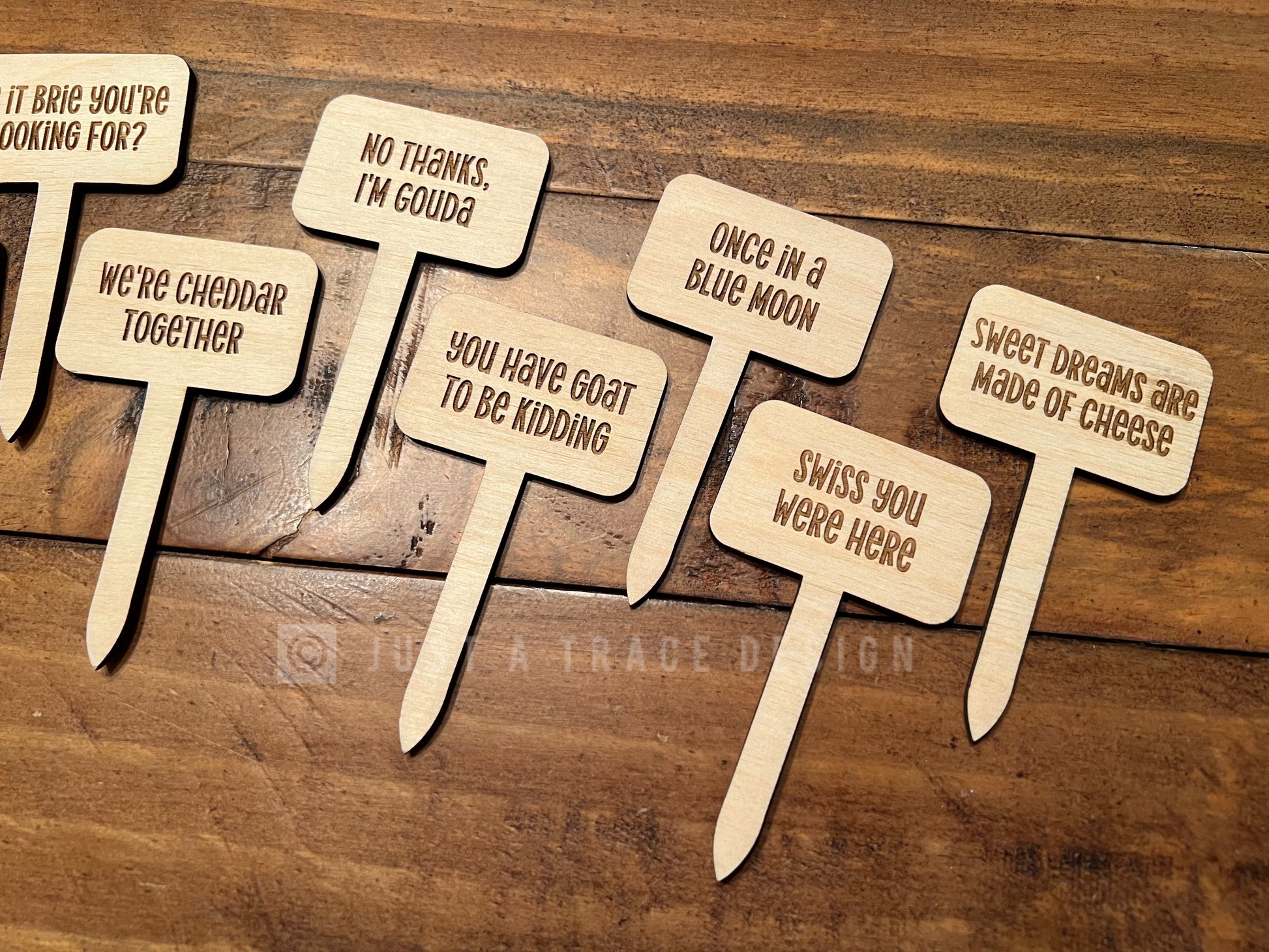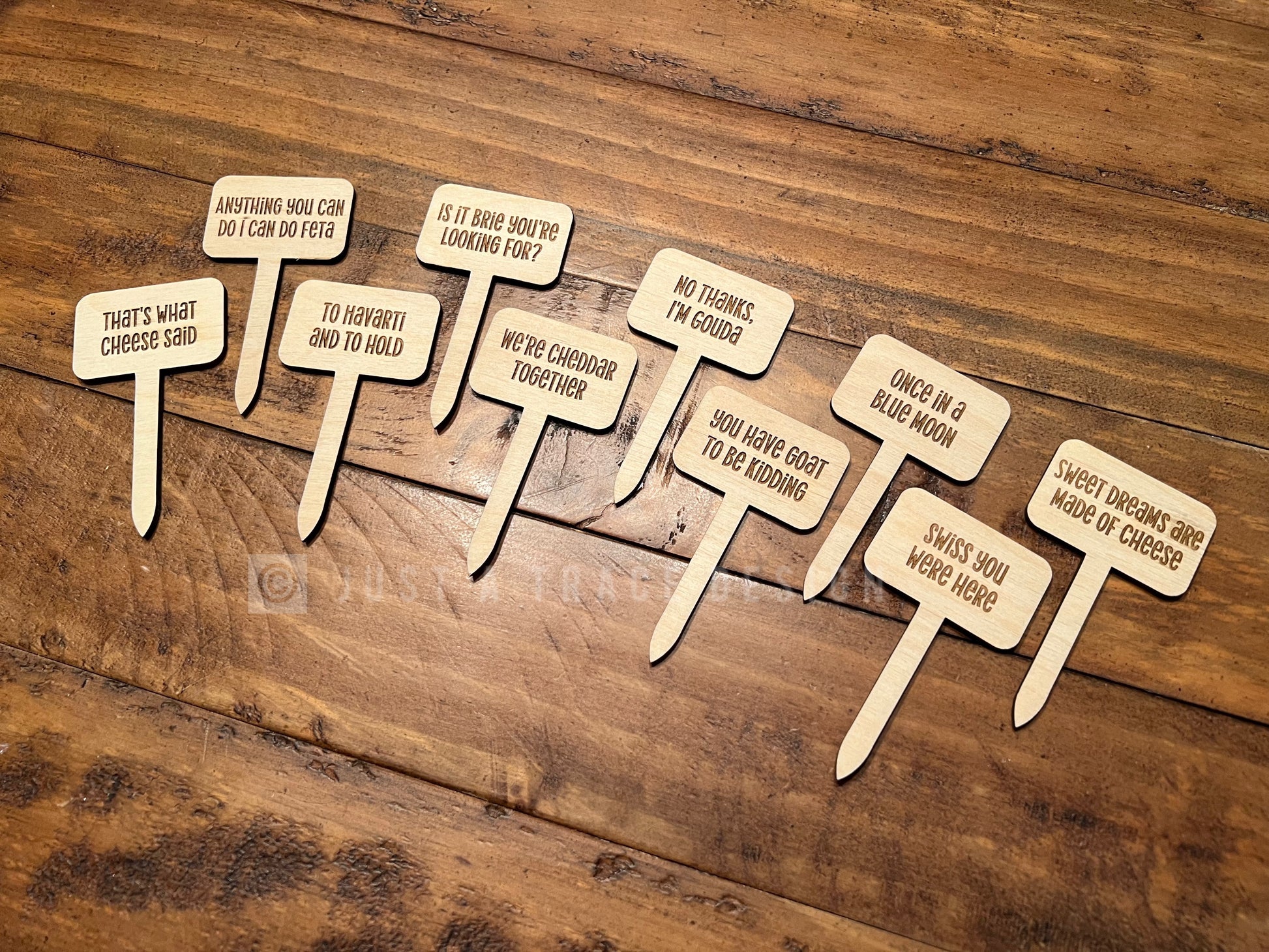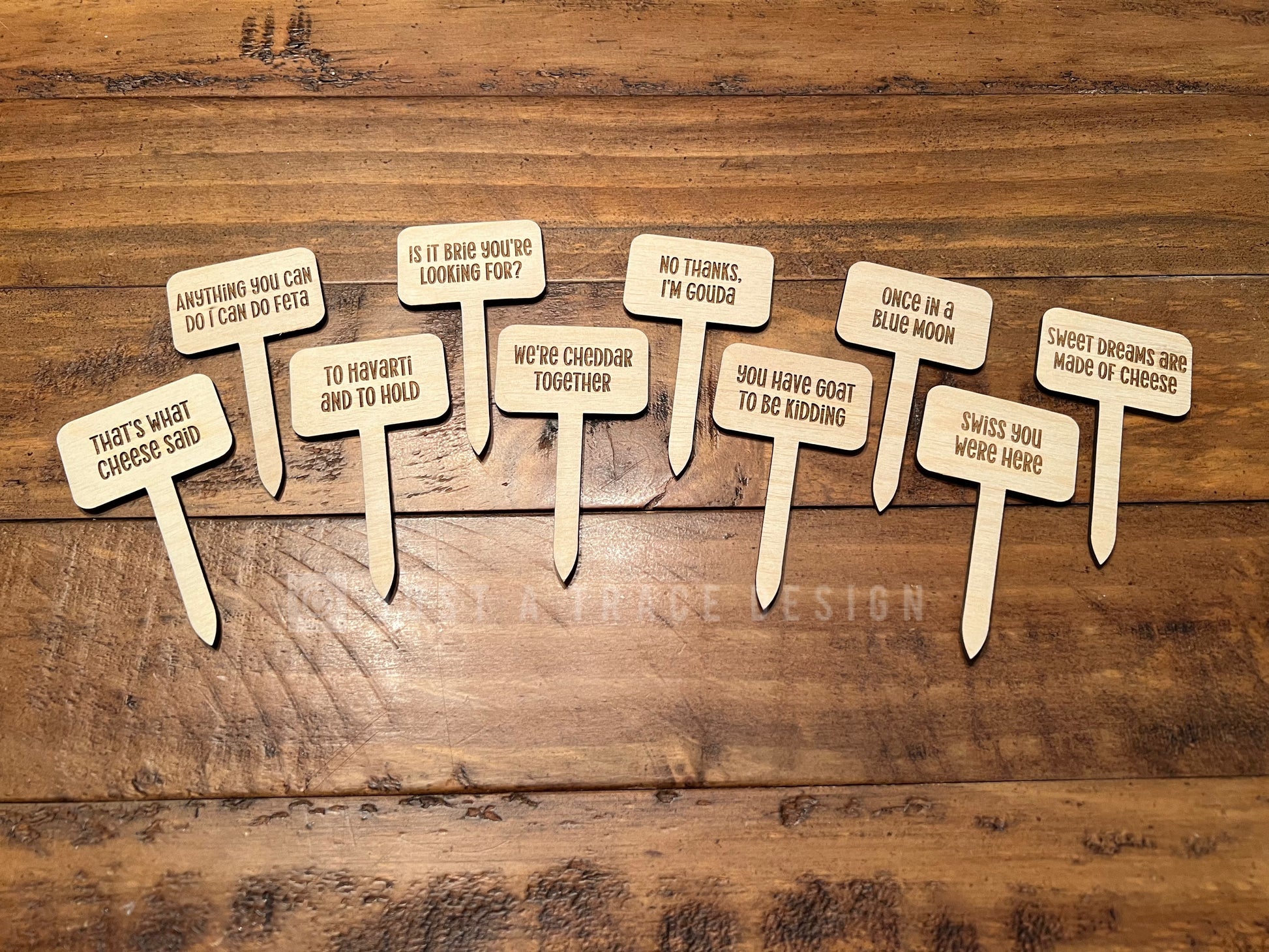 Set of 10 Wooden Punny Funny Cheese Markers, Grazing Board, Cheese Board, Serving Board, Charcuterie Board, Wood Cheese Picks, Food Marker