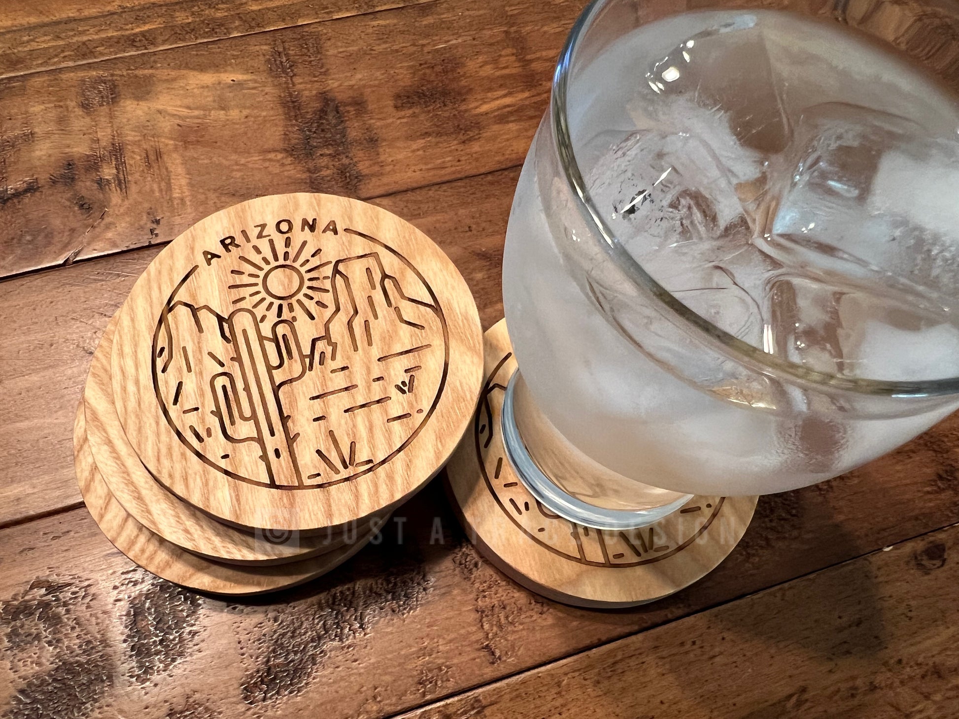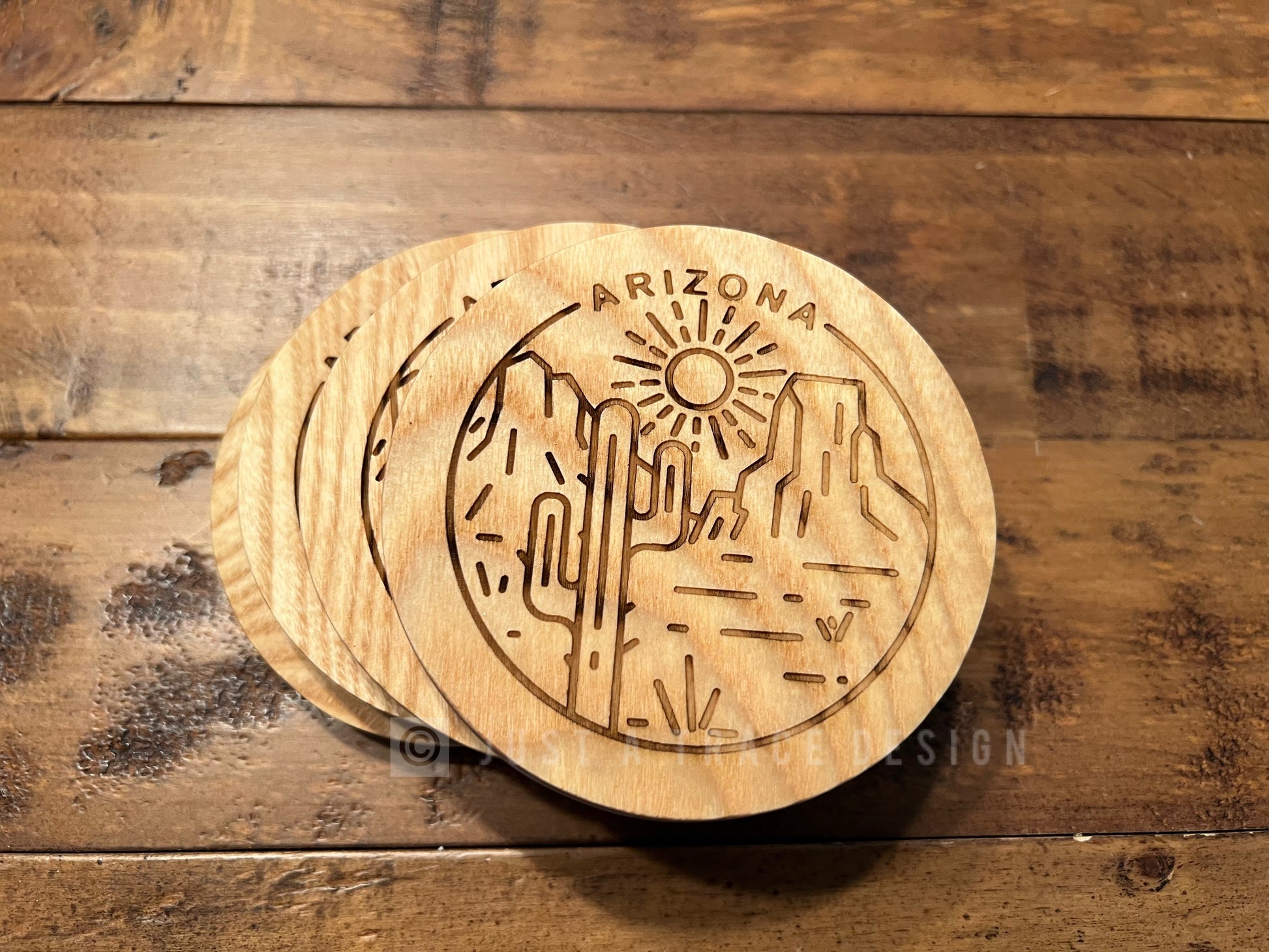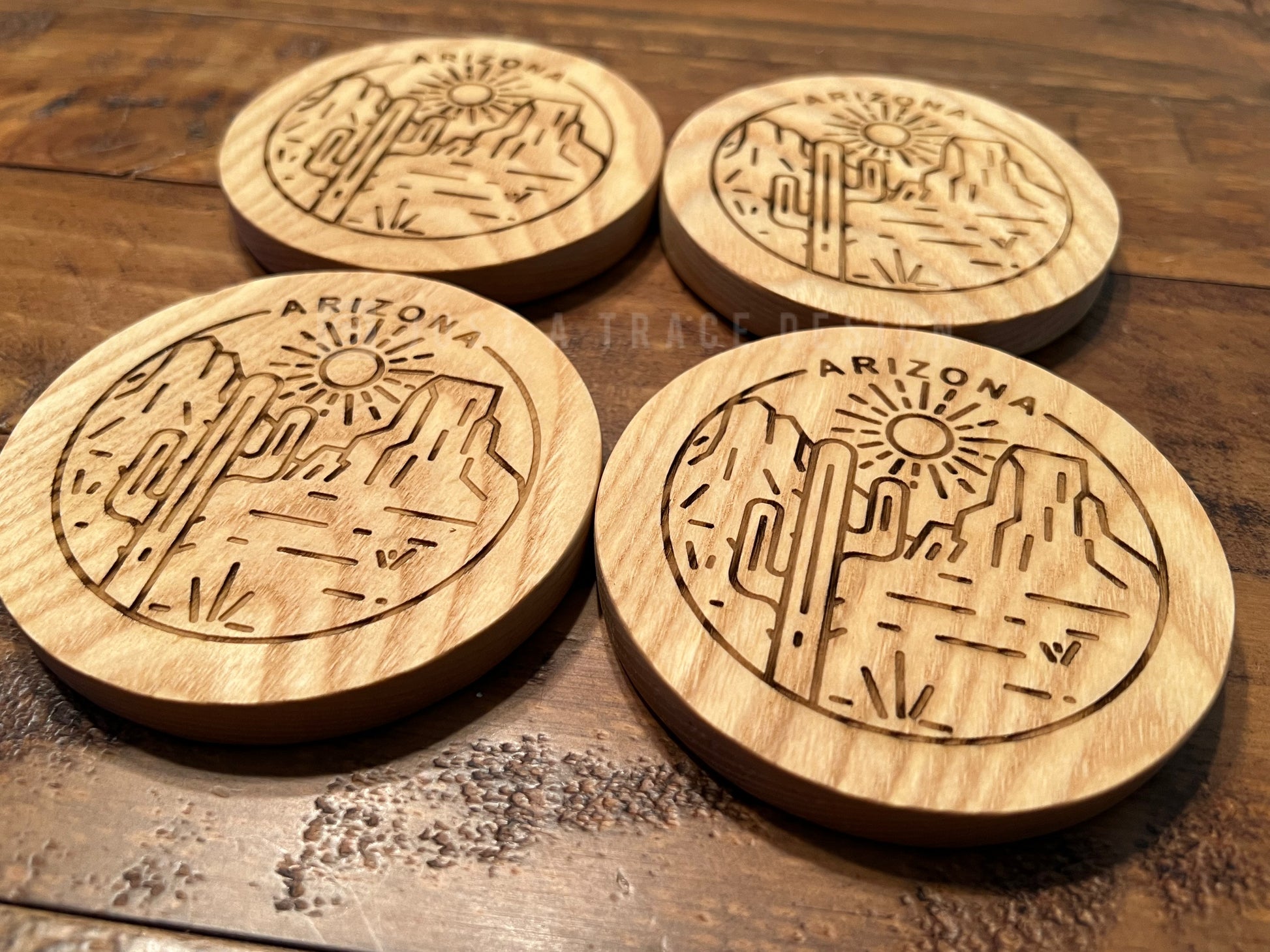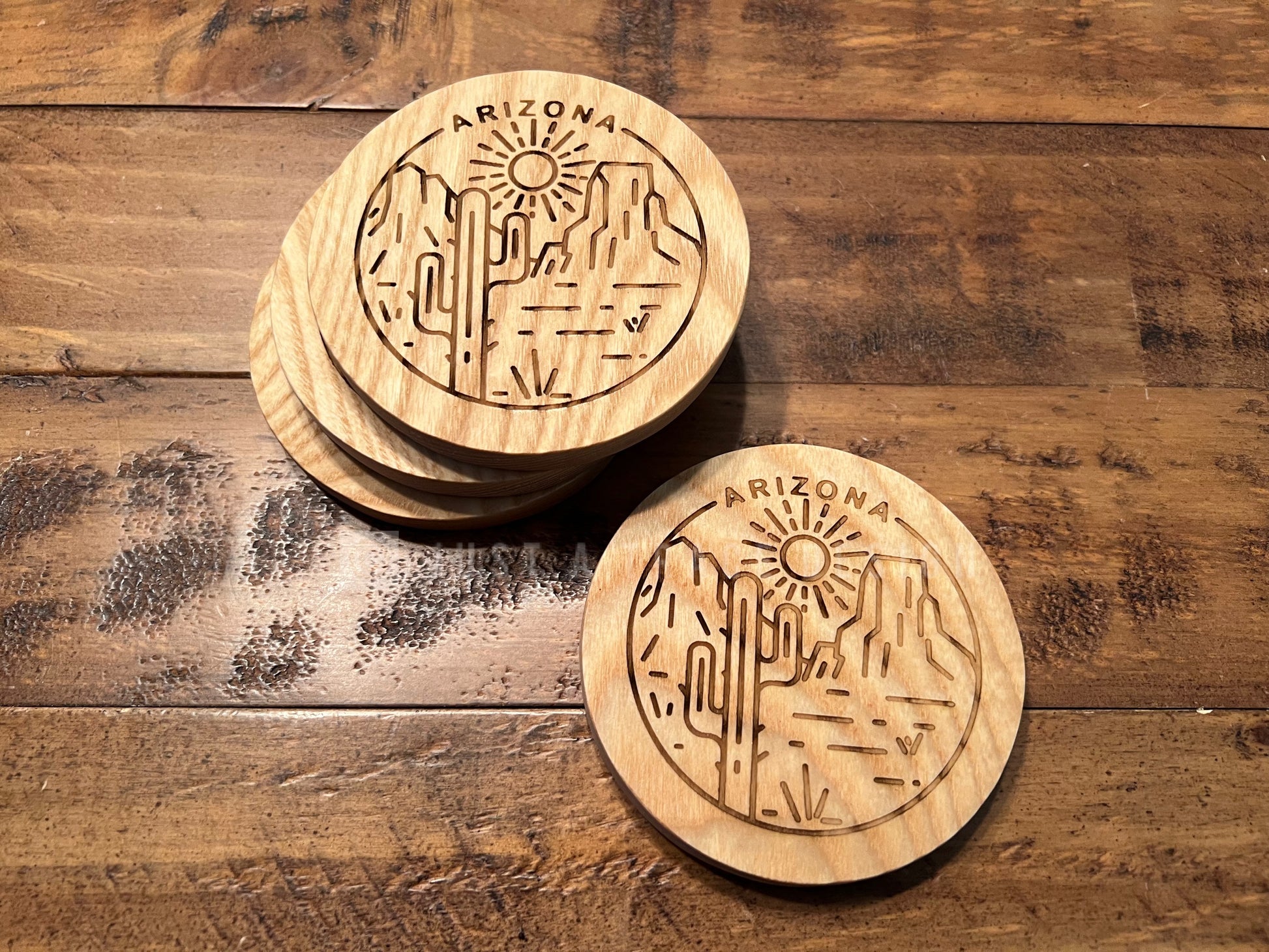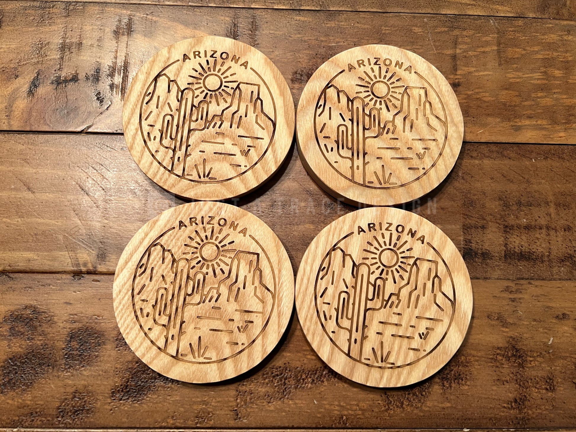 This set of 4 Round Wood Arizona Coasters has been handcrafted from hardwood. Available in your choice of Cherry or Ash hardwood. Engraved with a Arizona Desert Scene.