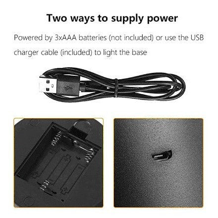 Includes acrylic sign and LED base with remote control that allows you to change the base to multiple colors. LED base is powered with 3 batteries (not included) or USB cord (included).