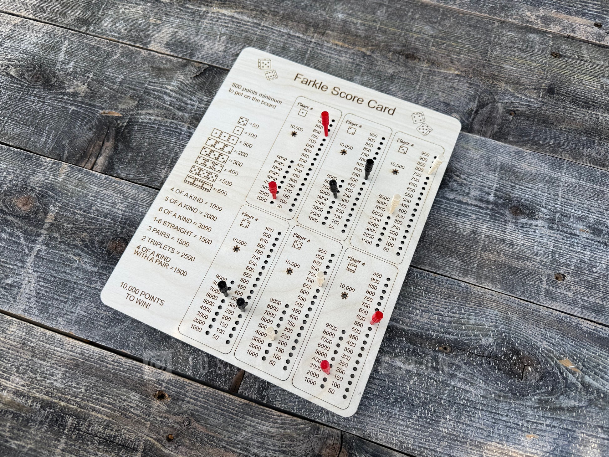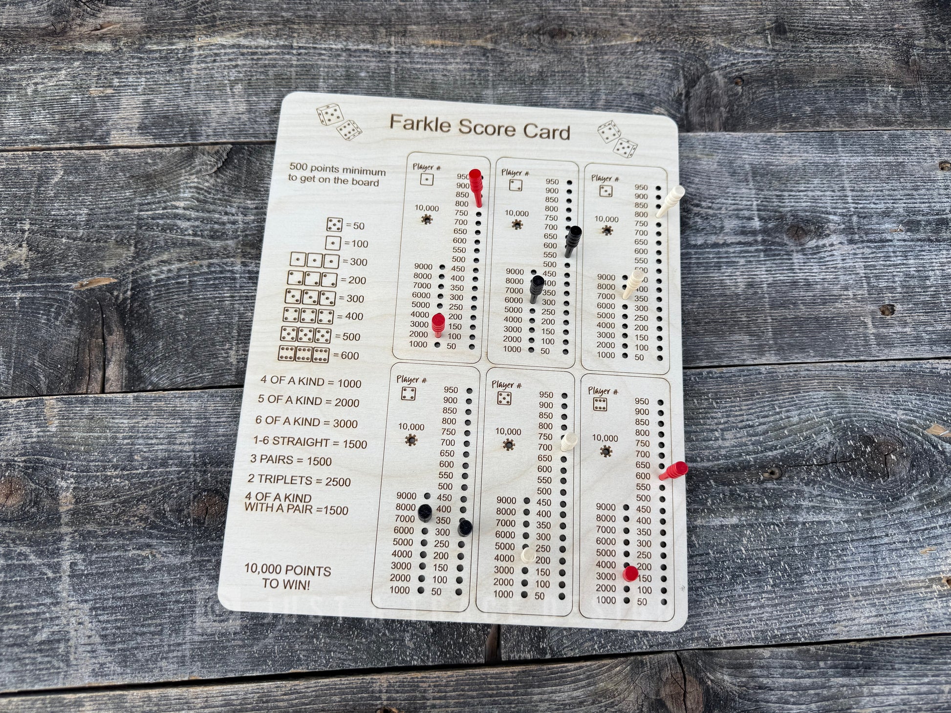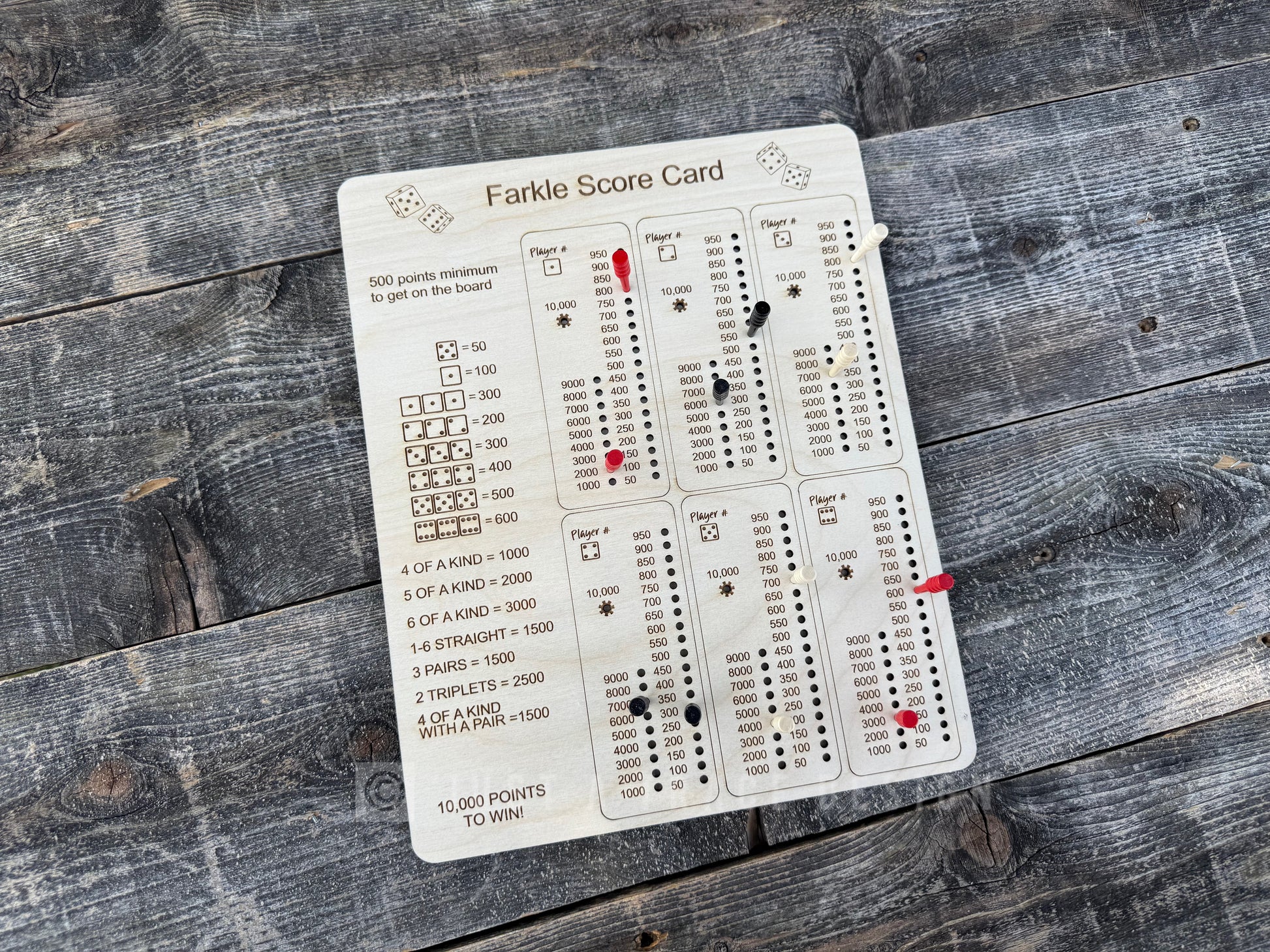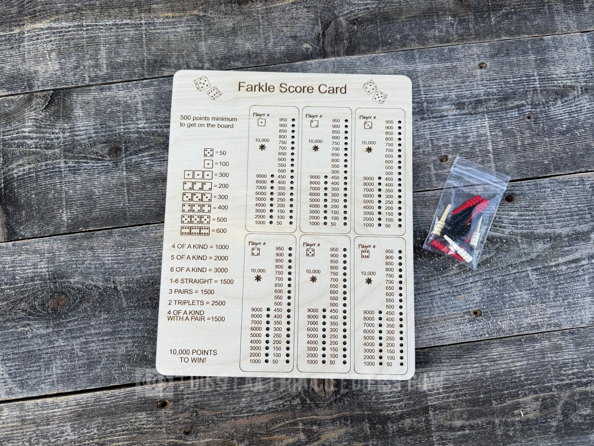 Our Wooden Farkle Score Card is a beautifully crafted, reusable scorekeeping board designed for the popular dice game Farkle.