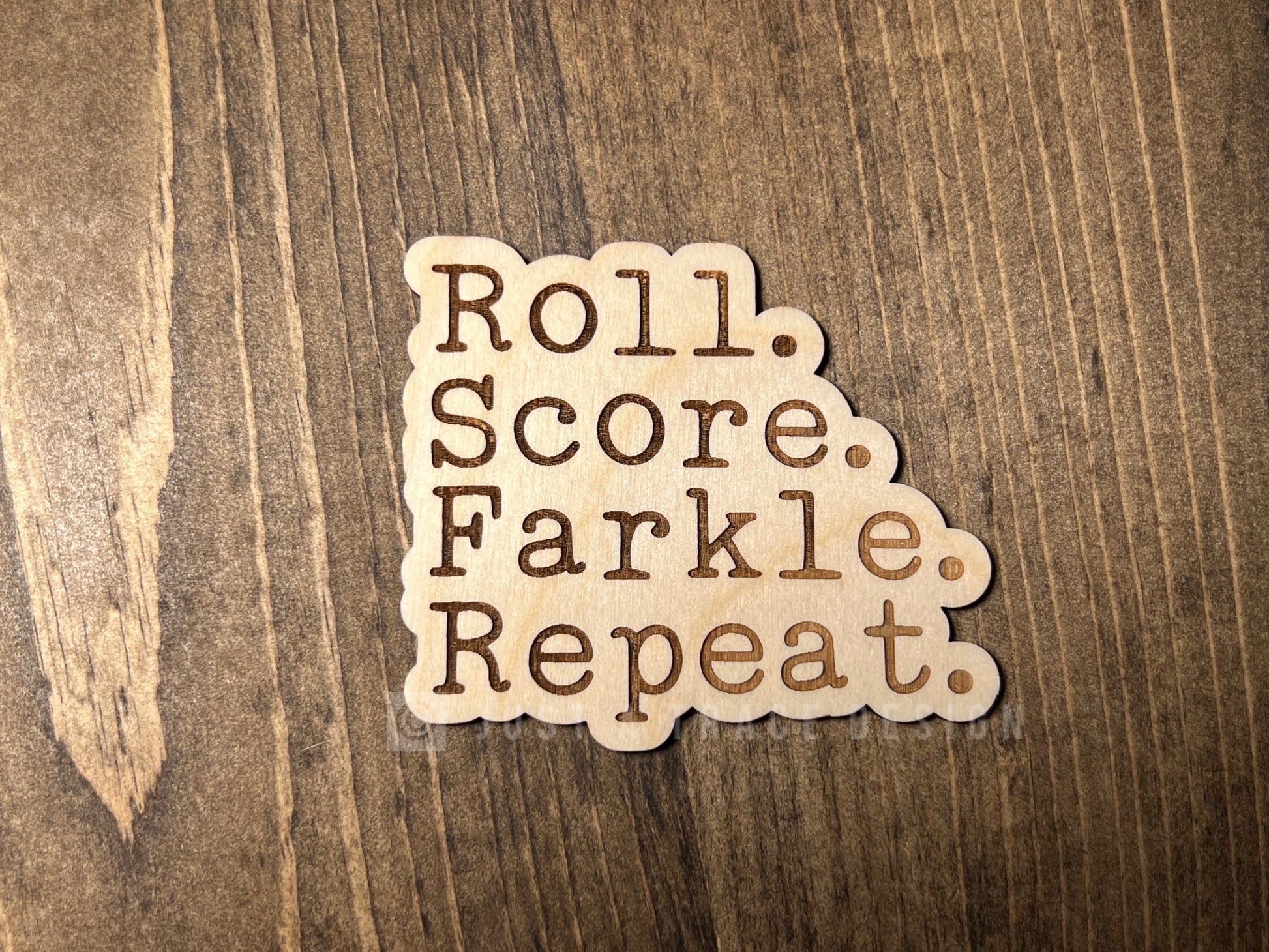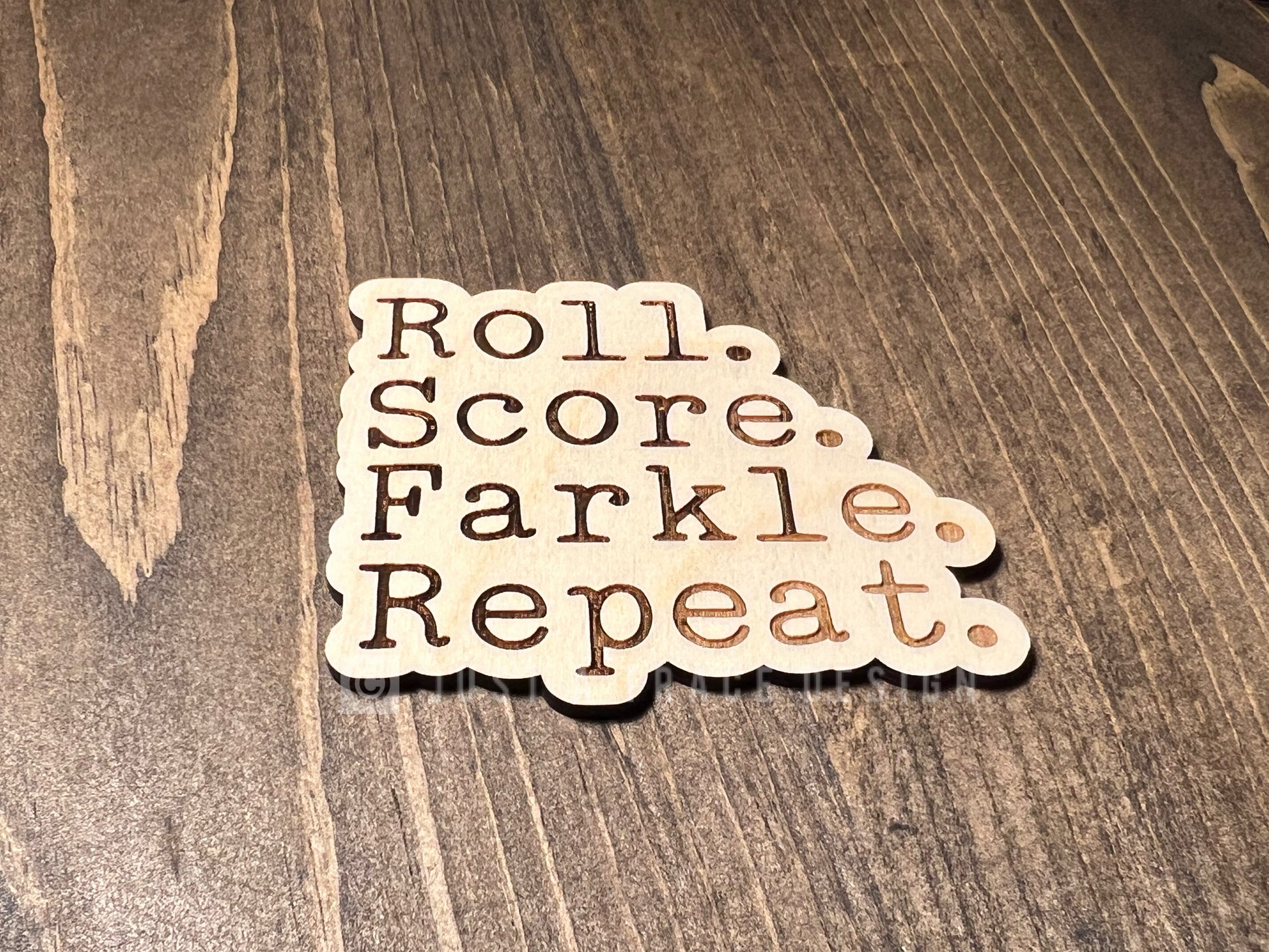 Add some flair to your fridge with the Roll Score Farkle Repeat Wood Magnet today! Perfect for a game room!