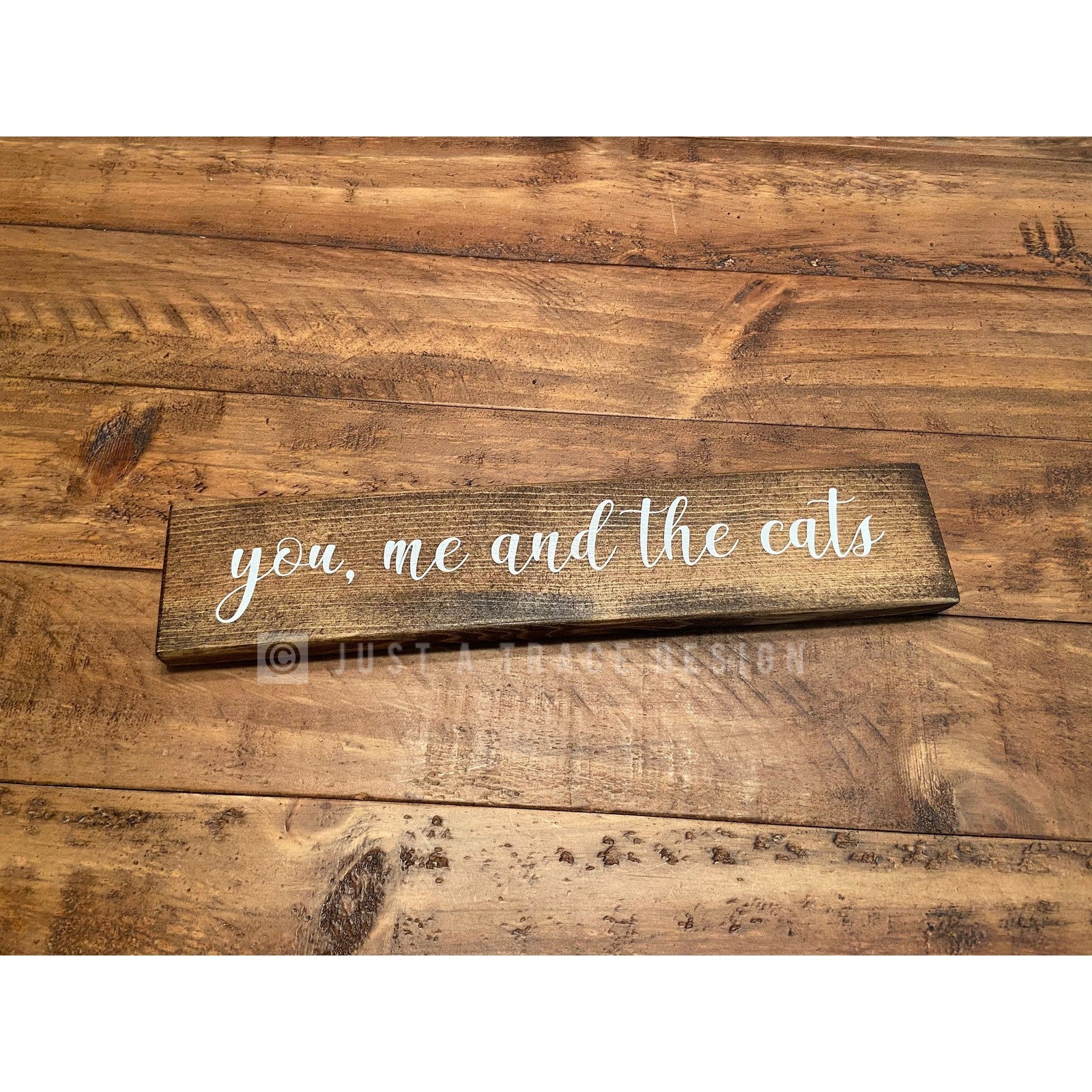 The You, Me And The Cats Sign is available in your choice of stains: Dark Walnut, Ebony and Golden Pecan (light wood). Letters are hand painted with white paint.